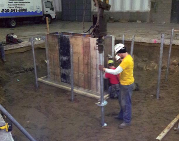 Helical piles were selected over the drilled piers. Helical piles can be installed quickly using relatively small equipment within limited access and low headroomconditions. Helical pile installation does not require casing where high groundwater is present, and does not create spoils to be hauled off site.
