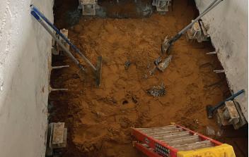 Helical piers were chosen as the preferred deep foundation alternative given the low mobilization costs, the ability to work in confined locations and the verification of capacity during installation by monitoring torque. A soil boring advanced at the elevator area showed loose sand below the elevator floors to a depth of about 15 feet where it transitioned to medium dense sand to the termination of boring about 40 feet below the floor elevations. At each elevator location, the design included eight underpinning locations with ultimate compression loads of 40.4 kips. Two-foot square access areas were sawcut in the existing floor at the eight underpinning locations The helical pier design included the Model HP288 (2.875-inch O.D. by 0.276-inch wall thickness) shaft with a 10”-12” helix plate configuration. The helical piers were installed to depths of 19 to 23 feet below the bottom of each elevator floor with final installation torques of at least 4,500 ft-lb. LRE was able to install the piers from the ground surface by reaching into the access opening with a small excavator and drive head. After the underpinning piers and brackets were installed, the wall loads were transferred to the piers. With the underpinning complete, the remainder of the existing floors were removed, and excavation was performed to facilitate pouring the new concrete floor systems at the proper elevation. The underpinning at both elevator locations was completed over a period of 4 days.