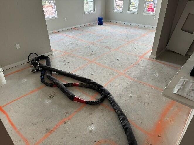 Helical piers were selected as the preferred solution for underpinning and lifting the structure back to its original elevation. Helical piers are often preferred over other deep foundation alternatives given the ability to work around tight access areas, underground and overhead utilities, quick installation, and lower costs relative to other systems. Once the underpinning and lifting work was completed, voids present under the slab would be filled with polyurethane foam. PolyLevel® polyurethane foam injection was selected as the preferred option based on cost effectiveness, speed of repair and the ability to use the facility immediately after placement of the material. PolyLevel® is a two-part urethane that expands into a rigid foam used to fill voids, stabilize slabs, and lift concrete. PolyLevel® can be injected below the concrete slab through 3/8-inch diameter drilled holes. Once the two parts are mixed, a chemical reaction converts the liquid urethane components into a strong, rapidly setting foam material. In its foam state, PolyLevel is extremely light, with different formulations weighing between 2 to 4 pounds per cubic foot (pcf). Other void-filling or lifting materials can weigh upwards of 120 pcf, adding significant weight to supporting soil or base materials and potentially contributing to further settlement.