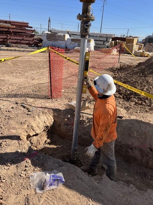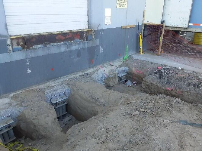 Located in Phoenix Arizona, the Altium Packaging facility is one of the largest suppliers of plastic containers and rigid plastic packaging. A 40,000 square foot addition was planned to the north of the existing building, which would almost double the facilities’ production area. The addition was designed as a slab-on-grade foundation system with 40-foot-high tilt-up panel exterior walls. A geotechnical investigation at the addition area showed uncontrolled fill to a depth of 1.5 feet underlain by soft to medium stiff clay to a depth of about 10 feet where loose sand was encountered to the termination of borings at 15 feet. Based on the poor bearing soils encountered during the investigation, the geotechnical engineer recommended removal of the soil to a depth of about 5 feet and replacement with engineered fill. With this recommendation, the allowable bearing capacity for a shallow foundation was limited to 2,000 pounds per square foot. Based on previous wall repairs at the existing north wall, a method to provide uplift capacity along the existing north wall was needed prior to construction of the addition. It was also necessary to underpin the existing north wall and provide a deep foundation alternative at the south wall of the addition prior to any excavation activities.