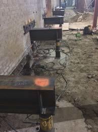 Helical piles were chosen as the ideal deep foundation solution given the limited access and tight working area. The helical pile configuration consisted of a square-bar “stinger” lead section, Model 200 (2.00-inch round corner square bar) with an 8”-10”-12” triple-helix arrangement, transitioning (via a special welded coupler) to a Model 350 (3.50-inch OD by 0.313-inch wall) hollow round shaft extension with a single 14” helix plate. The remaining lengths of the piles consisted of blank Model 350 extensions. The square-to-round “stinger” lead section was used to better penetrate the cobbly sand and weathered shale, while the helix plate configuration was selected to achieve the required torque prior to “spinning off” on the limestone. The 8” and 10” helix plates were each 0.5-inch-thick and utilized a V-style cut on the leading edge to help the piles advance through the cobbles and also aid in penetrating into the anticipated shale layer. The helical piles were advanced to achieve torque-correlated ultimate capacities of at least twice the design working loads (FOS≥2). The installed piles were fitted with new construction brackets and cast into T-shaped concrete saddle beams spaced along and perpendicular to the wall. The helical piles and saddle beams were positioned to avoid the existing brick piers. The “T” shape of the beams was required to install two helical piles on one end and a single helical pile on the other to resist the asymmetrical loading on the beams. With the saddle beams constructed, steel I-beams were placed through penetrations in the lower sections of the wall. Hydraulic jacks sitting on the saddle beams then supported the ends of the I-beams, thereby unloading the original steel channels beneath. The channels were removed and a new concrete grade beam was constructed to transfer the wall load to the saddle beams. The hydraulic jacks and steel beams were removed.