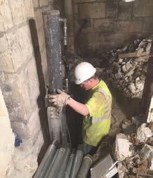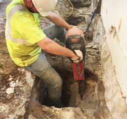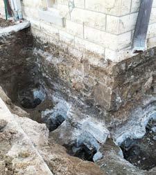 Thirty-six (36) Model 288 (2.875-inch OD by 0.165-inch wall) push piers were staggered along the inside and outside of the exterior walls at a two-foot, center-to-center spacing. The piers were installed opposite each other at the existing column locations. The footings were notched back to the face of the walls and the vertical and horizontal concrete surfaces trimmed smooth for uniform bearing against the retrofit bracket. The push piers were advanced to depths from 37 to 40 feet below grade to bear on the competent bedrock and achieve hydraulic fluid pressures of at least 4,000 psi, corresponding to approximately 56.7 kips of drive force. The piers were then connected in series to be simultaneously reloaded and locked off at a hydraulic pressure of approximately 2,650 psi, corresponding to 25.5 kips. The lock-off load greatly exceeded the design working load of 8.7 kips; however, care was taken during this process so as not to mobilize the structure (stabilize only). A factor of safety of at least 2.2 was achieved (FOS = drive load/lock-off load).