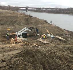 Two new, independent sections of stormwater outfall sewers were proposed through a flood mitigation levee along the east bank of the Missouri River. One section would be approximately 180 feet long of 48-inch-diameter ductile iron pipe. The second sewer section would be constructed roughly 1,000 feet to the south and be approximately 90 feet long of 60-inch-diameter pipe. The project designers specified new construction helical piles (both vertical and battered) to support the headwalls, pipe outfalls, pipe supports, and floodgate structures.
