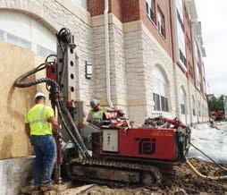 A system of hydraulically-driven push piers was selected as the ideal method to stabilize and potentially lift the settled portion of the building. Forty-one (41) Model 288 (2.875-inch O.D. by 0.165-inch wall) push piers were installed to support design working loads up to 25 kips and sixty-two (62) Model 350 (3.50-inch O.D. by 0.165-inch wall) push piers were installed to support design working loads up to 28 kips. A pair of either Model 288 or 350 push piers was installed where design loads at specified pier locations exceeded 28 kips. The piers were installed to depths from 20 to 24 feet below the existing footing and at an eight-foot maximum center-to-center spacing. Due to the presence of “floating” shale and limestone observed in the upper soil profile, the structural engineer specified pre-drilling at each pier location to ensure the piers would bear on competent bedrock. Hydraulic cylinders were then utilized to load the piers to at least 1.5 times the design load. The piers were grout filled and the upper several feet of the piers below the bracket encased