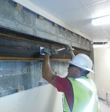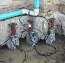 in concrete. Hydraulic lift cylinders were fitted to the installed pier assemblies and connected in series to uniformly reload the piers and lift the exterior wall approximately 0.5 inch back toward its original elevation. Two full-scale compression load tests (one for each shaft size) were performed prior to production pier installation to verify the deflection-to-load response. Load tests were completed away from the building using a typical load frame anchored with helical piles.
