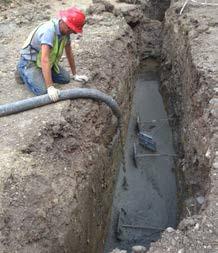 Lateral stabilization of the eastern wall section included a deadman-type wall system utilizing Geo-Lock® earth anchors. Twenty-six anchor (26) locations were spaced up to six feet on-center to resist a design working tension load of 9.3 kips. The anchors were installed by driving 0.75-inch-diameter threaded rod through holes drilled five feet below the top of the wall. The threaded rods were connected to earth anchor plates located within continuous trenches 25 to 42 feet from the building. The trenches were then filled with concrete. The interior connection detail included continuous, steel channel walers.