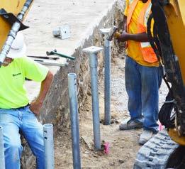Thirty eight (38) Model 288 (2.875-inch OD by 0.276-inch wall) hollow round shaft helical piles were installed to support a design working compression load of 25 kips. The piles utilized an 8”-10” lead section with a V-style cut on the leading edge of the first helix plate to help the piles better penetrate into the dense sand or weathered bedrock. Standard extensions advanced the piles to depths up to 36 feet and to torquecorrelated ultimate capacities of at least twice the design working load (FOS ≥ 2), or to spin-off on competent bedrock. The piles were fitted with standard new construction brackets to be cast within the grade beams and pile caps of the floodwall structure.