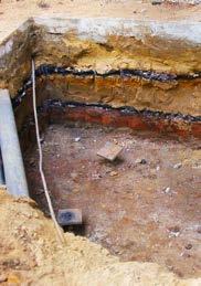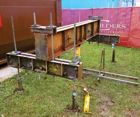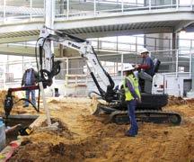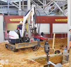 Helical piles can be installed quickly with relatively small equipment, making them the obvious choice to provide the additional column support. A load test was performed to verify pile capacity and depth. Each existing column location would include pile cap extensions supported by four helical piles. Each pile would support a design working load of 25 kips. The pile configuration consisted of Model 288 (2.875-inch OD by 0.276-inch wall) hollow round shaft with a 10”-12”-14” triple-helix lead section. Standard extensions advanced the piles to depths from 14 to 21 feet to achieve torquecorrelated ultimate capacities of at least twice the design working load (FOS ≥ 2). The piles were fitted with standard new construction brackets to be cast within the pile caps. Despite tight access and working conditions, 56 helical piles were installed within just four days.
