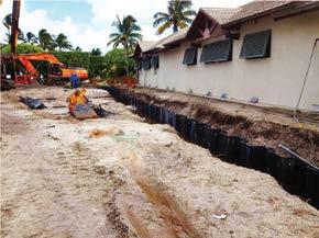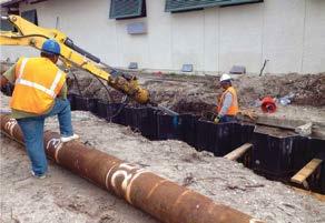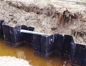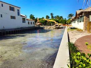 A 216-foot-long by 60-foot-wide, L-shaped inlet waterway was planned at the site of a bayside residence. The proposed dredging would allow water from the adjacent bay to flow along the north side of the property to wrap around the front of the home and create a 42-by-65-foot boat harbor. The private waterway would also be bound to the north by an existing parking garage complex. Prior to constructing the waterway, the residence was built and the dense vegetation between the home and the parking complex was removed. Composite sheet pile walls were proposed for the waterway’s perimeter. The sheet piles would need to be driven approximately 20 feet below grade and the walls anchored at the tops to allow for up to 12 feet of dredging. The wall anchor system would also have to avoid the auger-cast deep foundations of the newly-built home as well as the existing foundations/utilities of the parking garage.