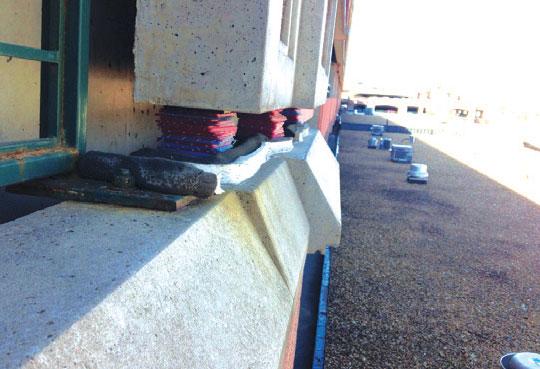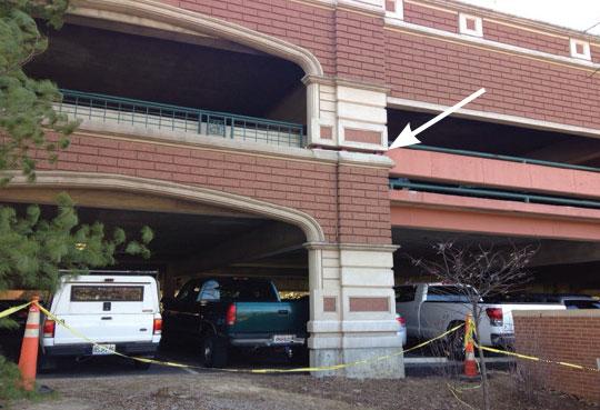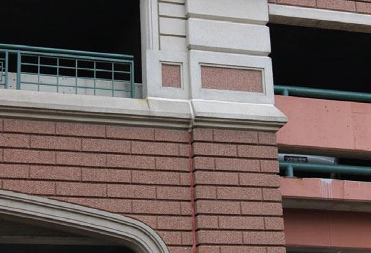 The parking garage was supported on drilled shaft foundations. The stonework façade was supported independently from the parking structure on shallow spread footings. A column footing supporting the façade settled approximately four inches, causing the first level facing to vertically separate from the façade above. Plastic shims were continually added at the separation, but a more permanent solution was required to stabilize the footing and prevent further settlement.