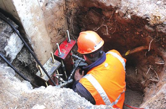 The piers were driven to refusal (drive force of at least 53 kips) and an average depth of 15 feet below the bottom of the footing. Hydraulic lift cylinders were fitted to the installed pier assemblies and connected in series to apply uniform load and lift the footing. The plastic shims were removed and the settled façade was successfully lifted to make contact with the upper section. The joint was resealed by the general contractor. Both the pier installation and structural lift were completed in just one day.