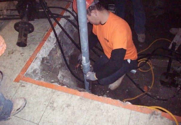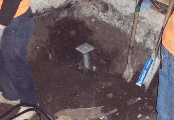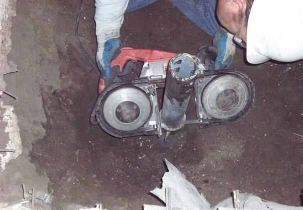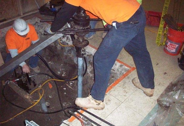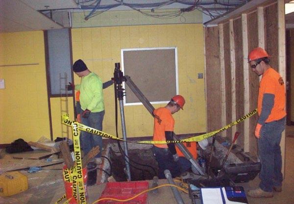 During installation, old concrete foundations were encountered below the pit excavation. While the helical piles effectively “churned” through most of the surficial ruble and debris, they could not penetrate this large obstruction. A mini drill rig was brought in to core through the existing footing and allow for the helical pile installation.