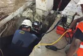 Helical piers with side-load retrofit brackets were selected to support the additional column loads. The helical piers consisted of the Model 350 (3.5-inch OD by 0.340-inch wall) round shaft with an 8”- 10”-12” helix plate configuration. The piers were installed in a near-vertical orientation on opposing sides of each of the two columns (four piers total). The helical piers were advanced to depths from 77 to 84 feet below the footing to bear the helix plates below the old lake bottom elevation and to achieve torque-correlated ultimate capacities of at least 103 kips (FOS≥2). The retrofit brackets were set against the footing and the piers were loaded to the design working load of 51.5 kips and locked-off. Special care was taken to verify that no movement occurred at the columns during the loading process. The pier sections and bracket components were hot-dip galvanized for corrosion protection. The retrofit brackets and the top several inches of the piers were also cast in concrete. The four retrofit helical piers were installed in one day.